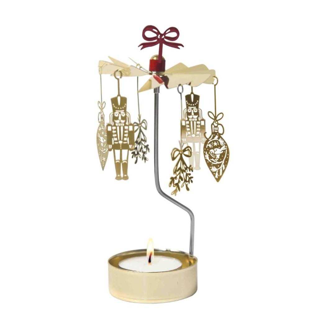 Breng direct kerstsfeer in huis met deze Angel Chimes Notenkraker van Pluto Design. Het warme theelichtje laat de metalen vleugeltjes zacht ronddraaien, waardoor de gouden notenkrakers en kerstornamenten speels meebewegen. Een klassiek, bijna magisch winters tafereel – maar dan in een moderne, stijlvolle uitvoering.