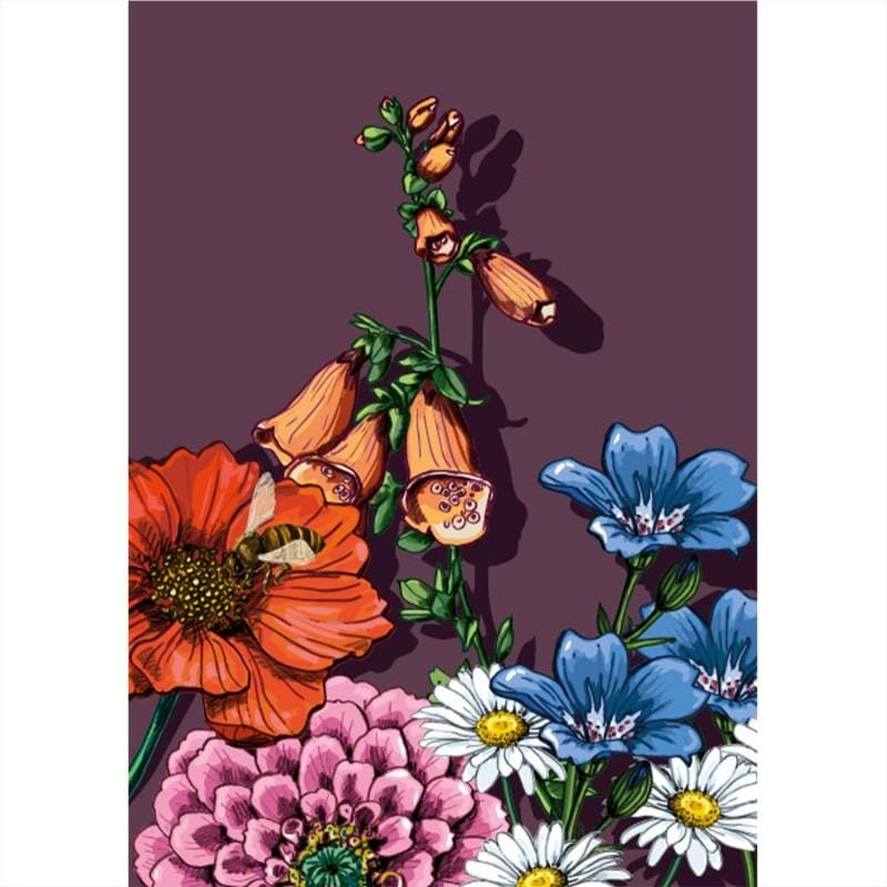 Ansichtkaart Talibo toont een levendige compositie van verschillende bloemen, waaronder vingerhoedskruid, margrieten en kleurrijke bloesems, samengebracht tegen een diepe, warme achtergrond. De combinatie van vormen en kleuren geeft de kaart een gelaagde en bijna schilderachtige uitstraling. Een kaart die blijft boeien en zich leent voor allerlei momenten, van een persoonlijke boodschap tot een klein kunstwerkje.