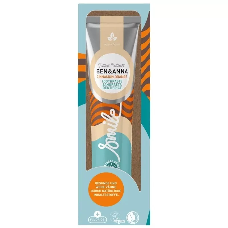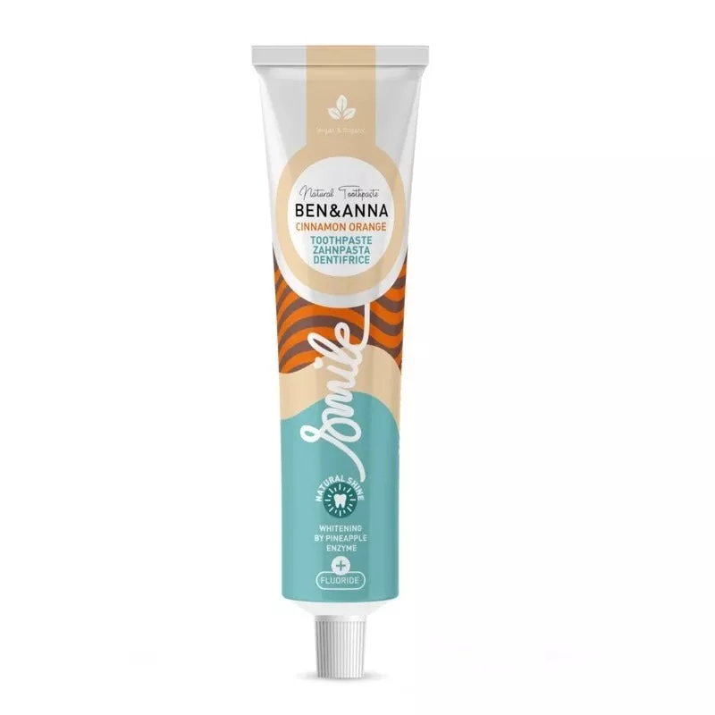 Fruitige tandpasta met fluoride, sinaasappel en kaneel. Beschermt tegen bacteriën en geeft een frisse adem, natuurlijk en vegan.