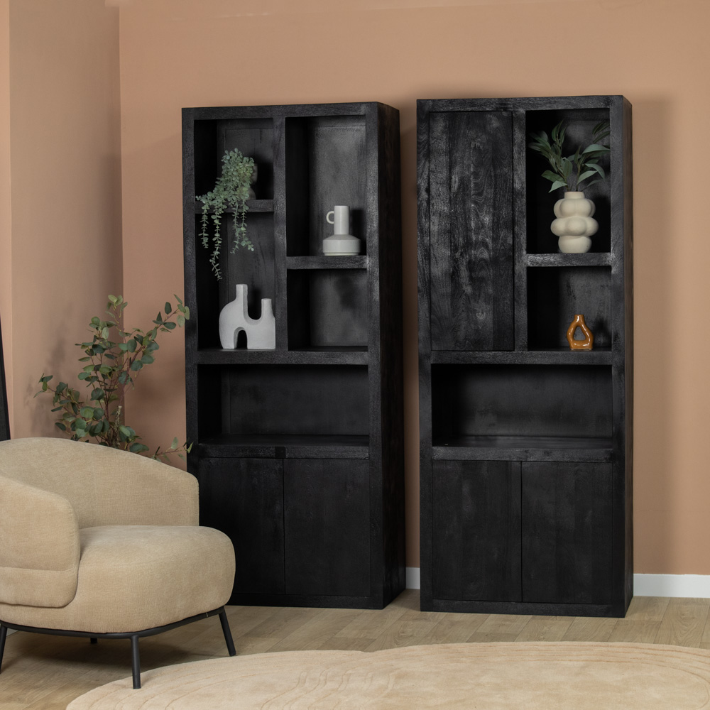 De Sven boekenkasten combineren tijdloos design met de warme uitstraling van mangohout. Verkrijgbaar in zand- en zwartkleurige afwerking en in verschillende formaten, passen deze kasten perfect binnen moderne en hotel chique interieurs. De open vakken bieden ruimte voor boeken, decoratie en persoonlijke accessoires, terwijl de variant met deur extra opbergruimte biedt. Dankzij het strakke silhouet en natuurlijke materiaalgebruik brengt de Sven collectie een gevoel van rust, luxe en evenwicht in elke woonkamer.