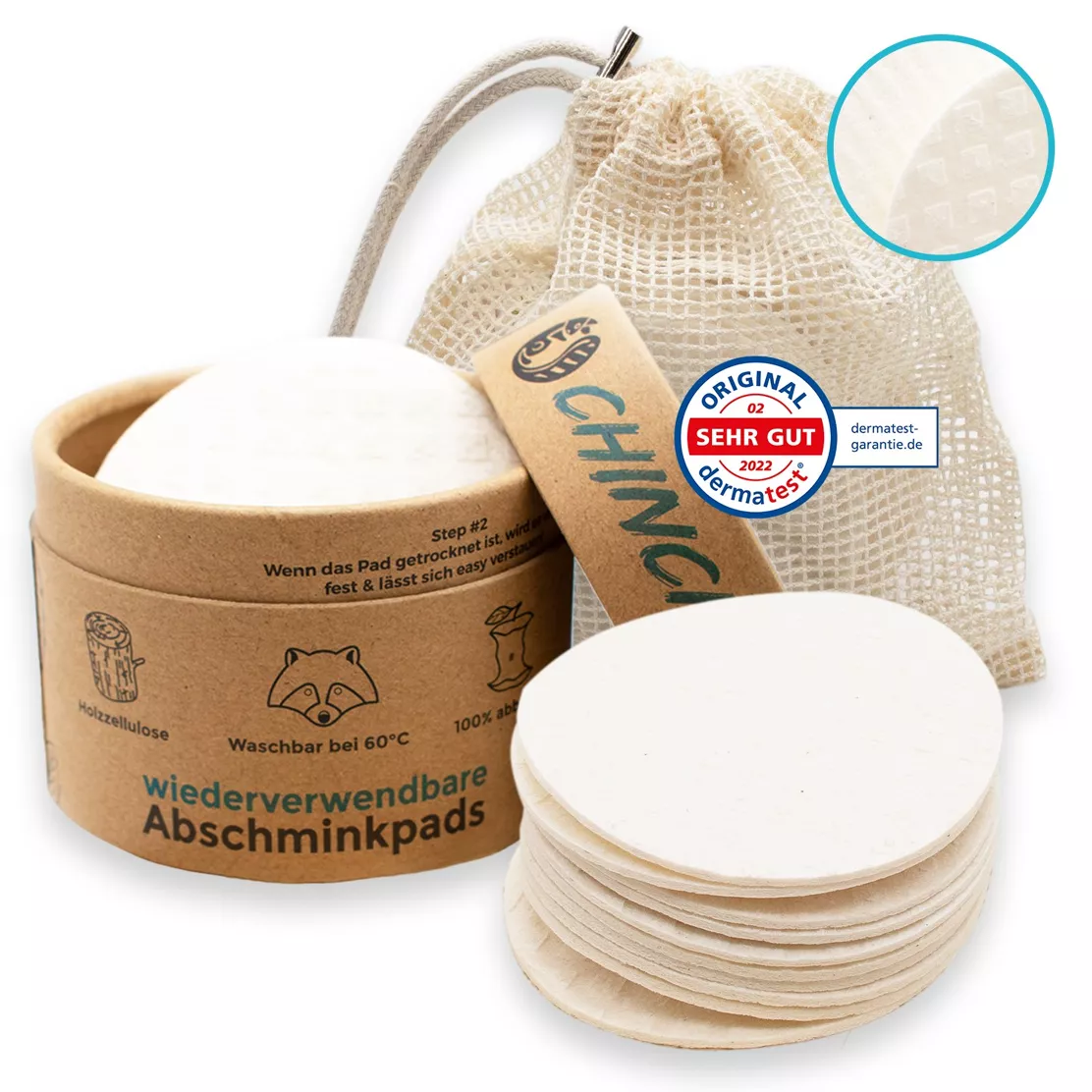Duurzame wattenschijfjes van houtcellulose & katoen. Wasbaar, plasticvrij en zacht voor elke huid. Inclusief wasnetje & opbergdoos.