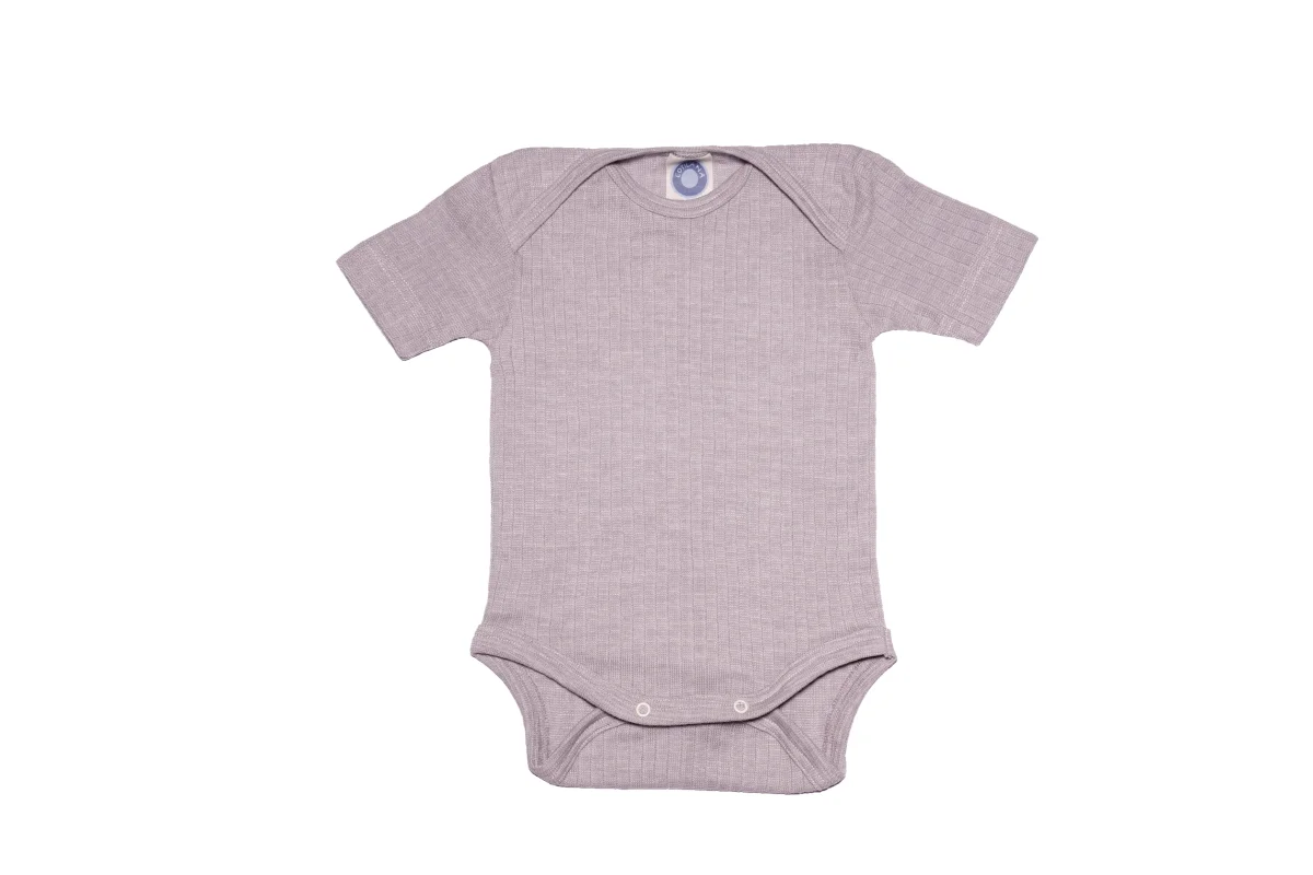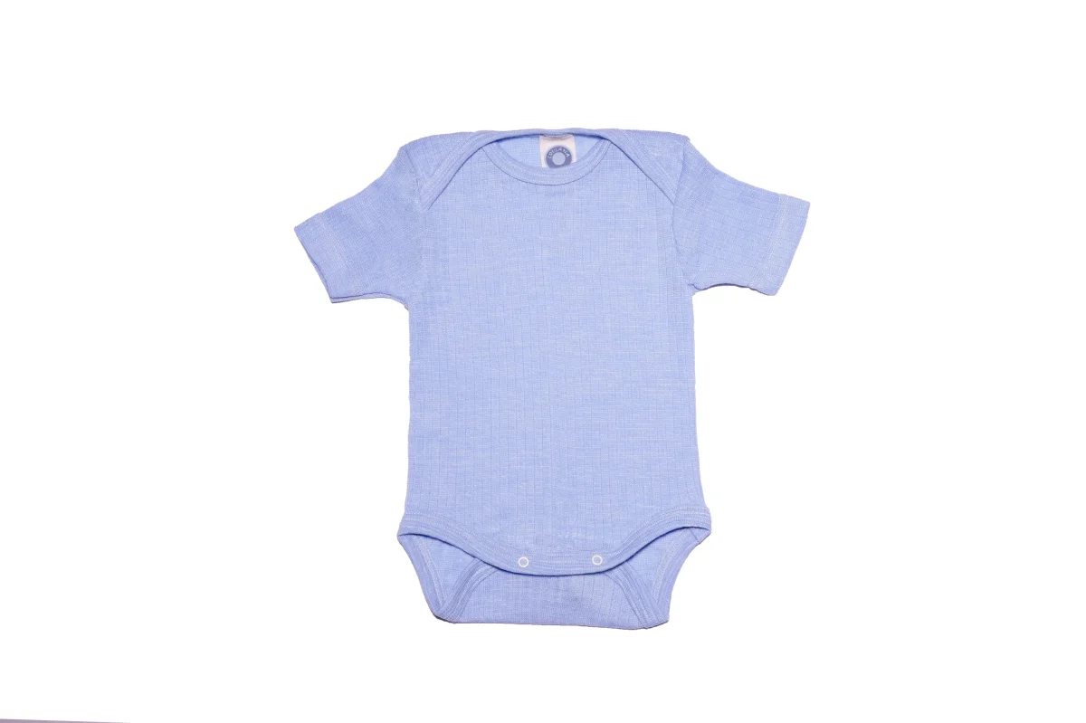 Romper van biologische wol, zijde en katoen. Zacht, ademend en temperatuurregulerend. Comfortabel voor de gevoelige babyhuid.