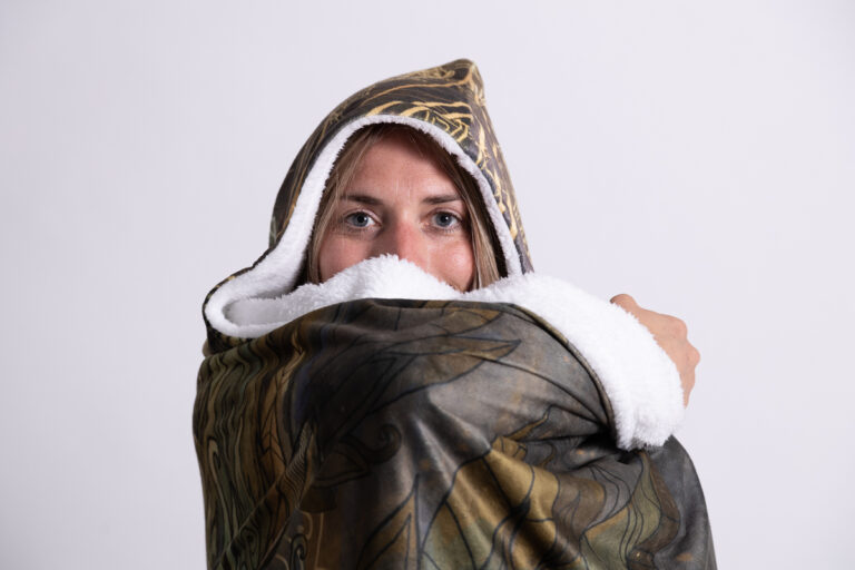 De Spacedeken is ook te gebruiken als hoodie, je kunt hem lekker om je heen wikkelen wanneer je naar buiten gaat.