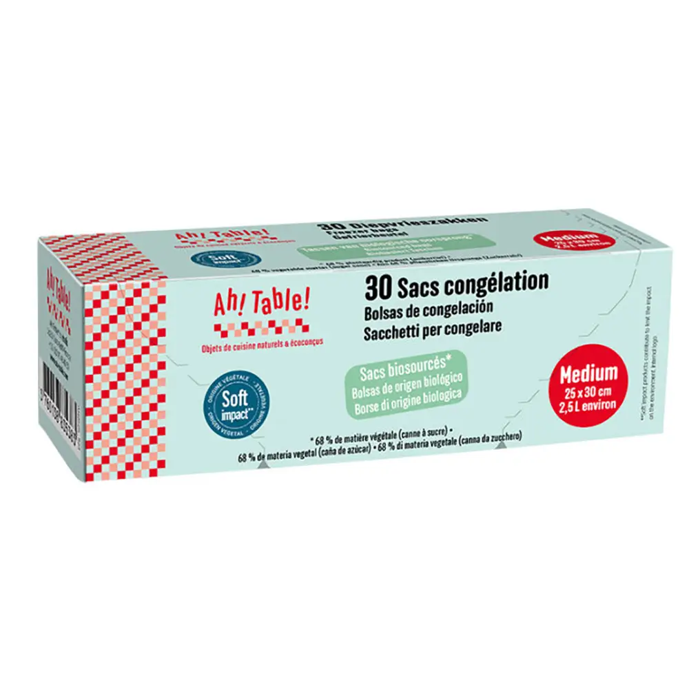 Ecologische diepvrieszakken van bioplastic. Maat M (25x30cm), 30 stuks. BPA-vrij, recyclebaar en CO₂-arm geproduceerd.