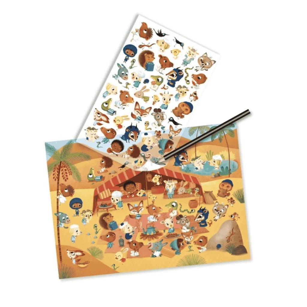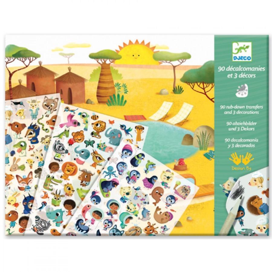 Met deze transferstickers van Djeco maken kinderen hun eigen dierenwereld. In de set zitten drie grote geïllustreerde achtergronden – de savanne, de woestijn en de noordpool – waar kinderen hun favoriete dieren en figuren op kunnen plaatsen.