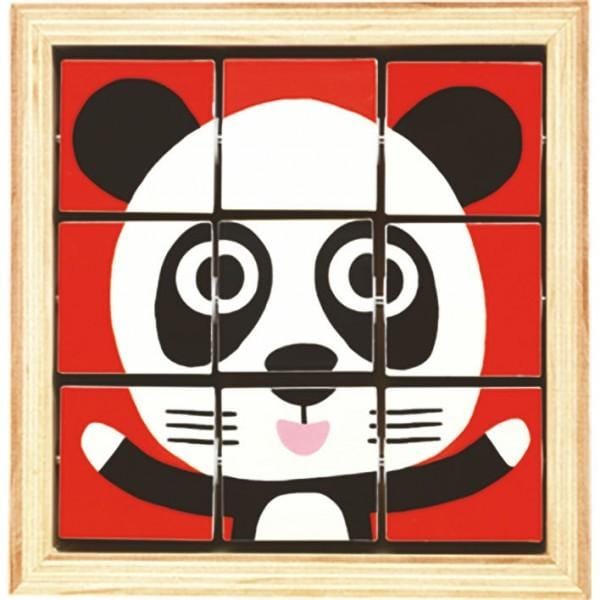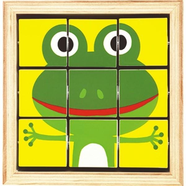 Drie puzzels, handig verpakt in een houten doos. De driehoekige stukken draaien om een as en zitten dus vast in de doos. Zo kan er nooit een stukje kwijt raken. De puzzels bestaan uit 9 stukken en je kan een leeuw, kikker of panda maken. Een puzzel die veel speelplezier geeft aan jonge kinderen.