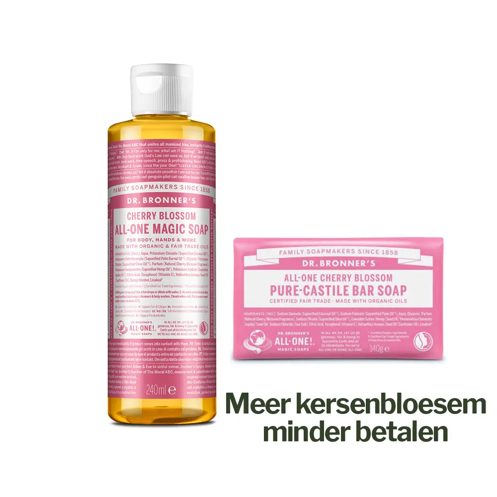 Leg jezelf in de watten met het Dr. Bronner’s Cherry Blossom zeepblok en vloeibare zeep. Voor je handen, lichaam en gezicht.