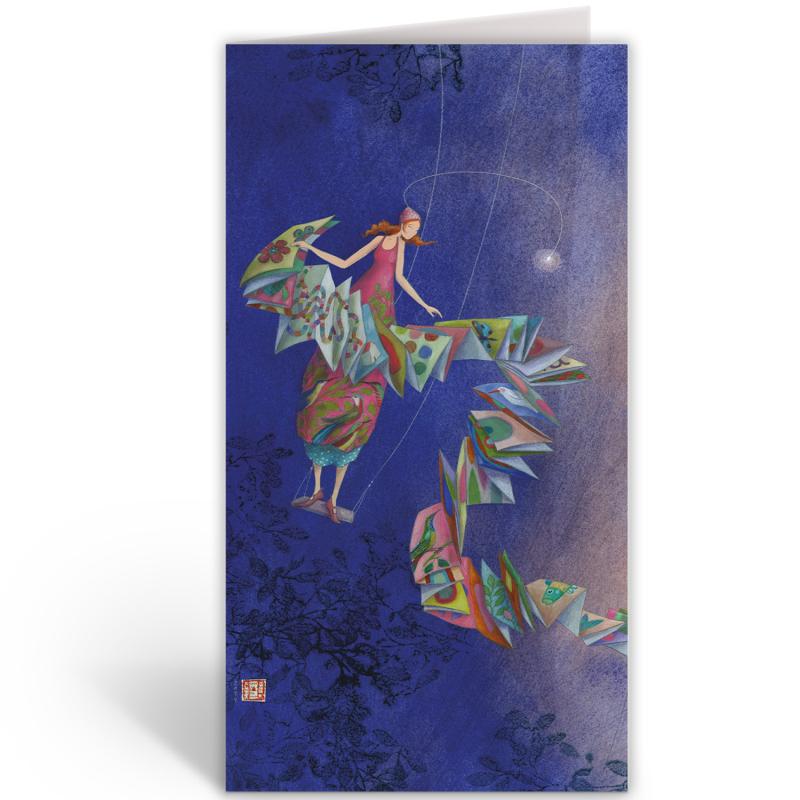 Deze bijzondere dubbele kaart van kunstenares Gaelle Boissonnard is een klein kunstwerk op zich. Het ontwerp ‘Des Histoires’ toont een dromerige figuur in kleurrijke kleding, balancerend tussen verhalen die zich ontvouwen als een lint van illustraties. De diepe blauwtinten en verfijnde details zijn afgewerkt met een waxachtige beschermlaag en subtiele hoogglansaccenten die het geheel een extra luxe uitstraling geven.