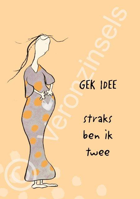 Soms is het bijna niet te bevatten… Van één naar twee! De dubbele kaart ‘Gek Idee (Straks ben ik twee)’ van Veronzinsel is een speelse en treffende manier om een zwangere vrouw te verrassen.