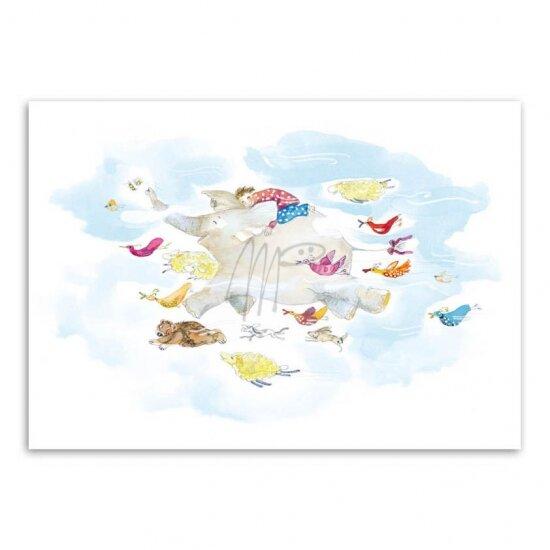 Laat je verbeelding de vrije loop met deze prachtige dubbelekaart. Een dromerig tafereel waarin een kind zich mee laat voeren door een vliegende wolf, omringd door kleurrijke vogels. Perfect voor liefhebbers van fantasievolle illustraties.