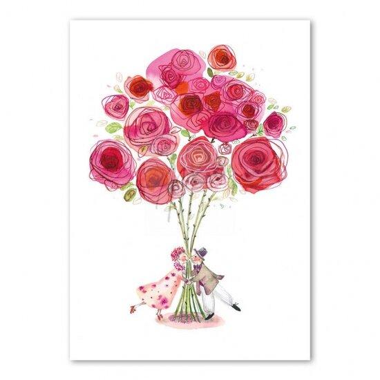 Een gigantische bos rode rozen omhelst een stel in een liefdevolle omarming. Een perfecte kaart voor romantische momenten, jubilea of een speciale liefdesverklaring.