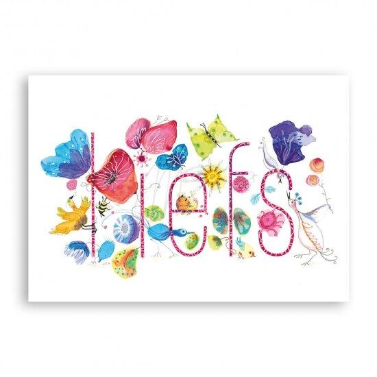Een liefdevolle kaart met het woord ‘Liefs’ omringd door sierlijke bloemen en speelse vlinders. Een warme en veelzijdige boodschap die geschikt is voor elke gelegenheid waarin je iemand wilt laten weten dat je aan hen denkt.