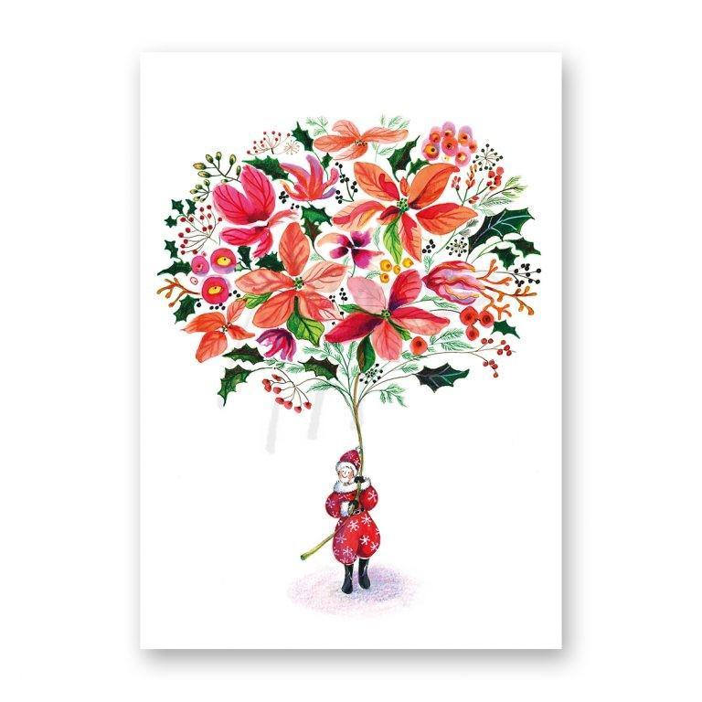 Een klassieke en feestelijke kerstkaart met een sierlijke boom vol kerstbloemen en hulst, vastgehouden door een lief kerstfiguurtje. Een sfeervolle kaart die warmte en magie uitstraalt.