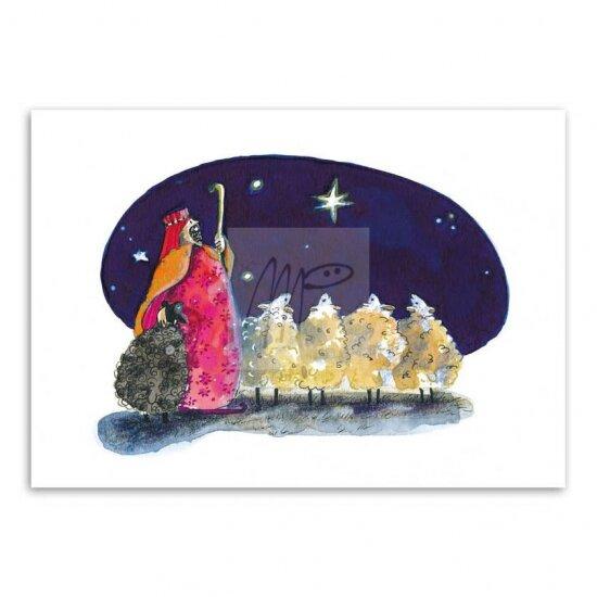 Onder een stralende ster waakt een herder over zijn kudde, gehuld in warme tinten en kerstsfeer. Een sfeervolle kerstkaart die de traditionele kerstgedachte perfect weergeeft.