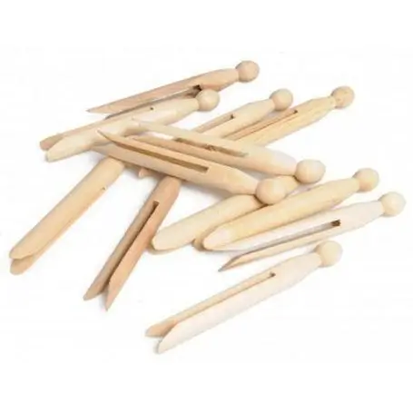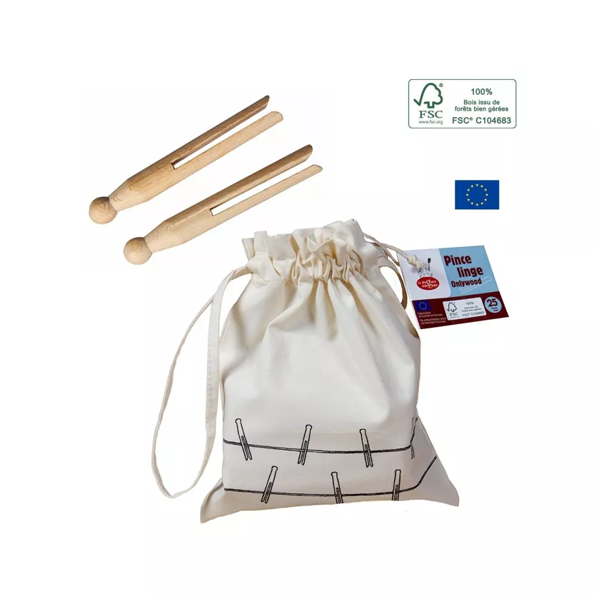 Set van 25 FSC‑beukenhouten wasknijpers zonder veer, inclusief biologisch katoenen tasje. Sterk, retro en plasticvrij.