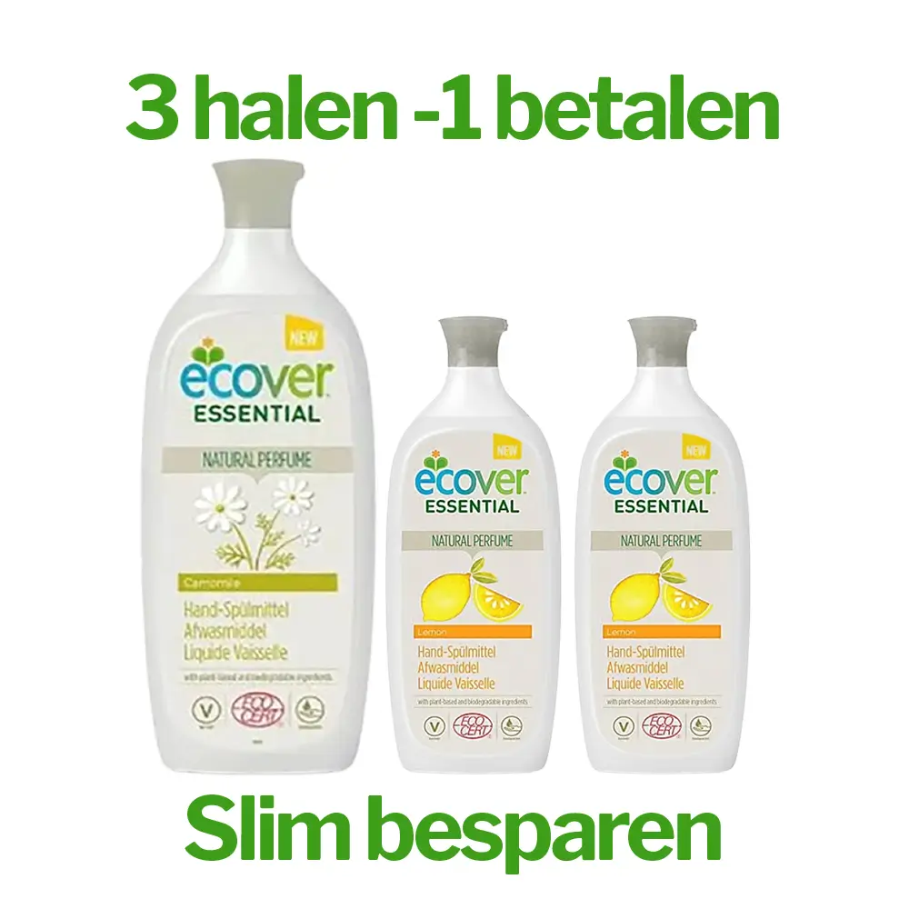Bespaar met Ecover Essential: 1× Kamille 1000 ml + 2× Citroen 500 ml gratis. Frisse, krachtige en duurzame afwas, één prijs, dubbel voordeel.