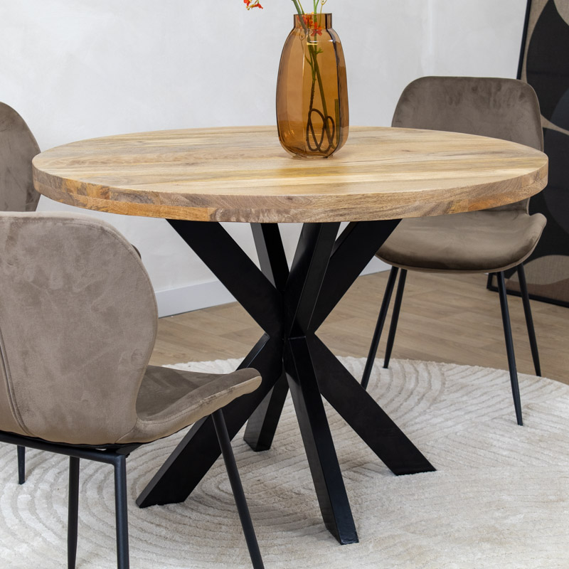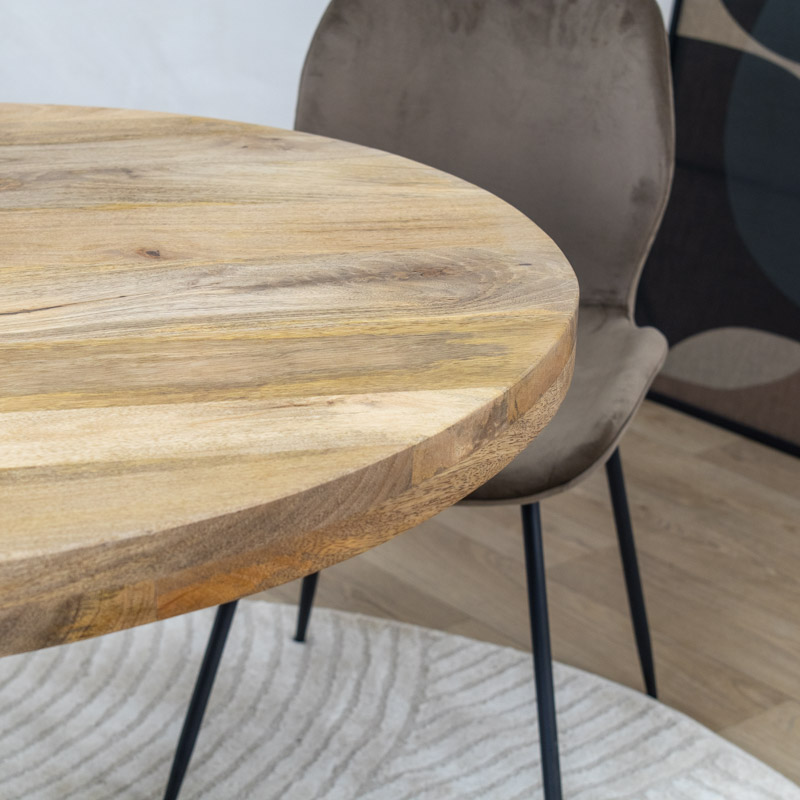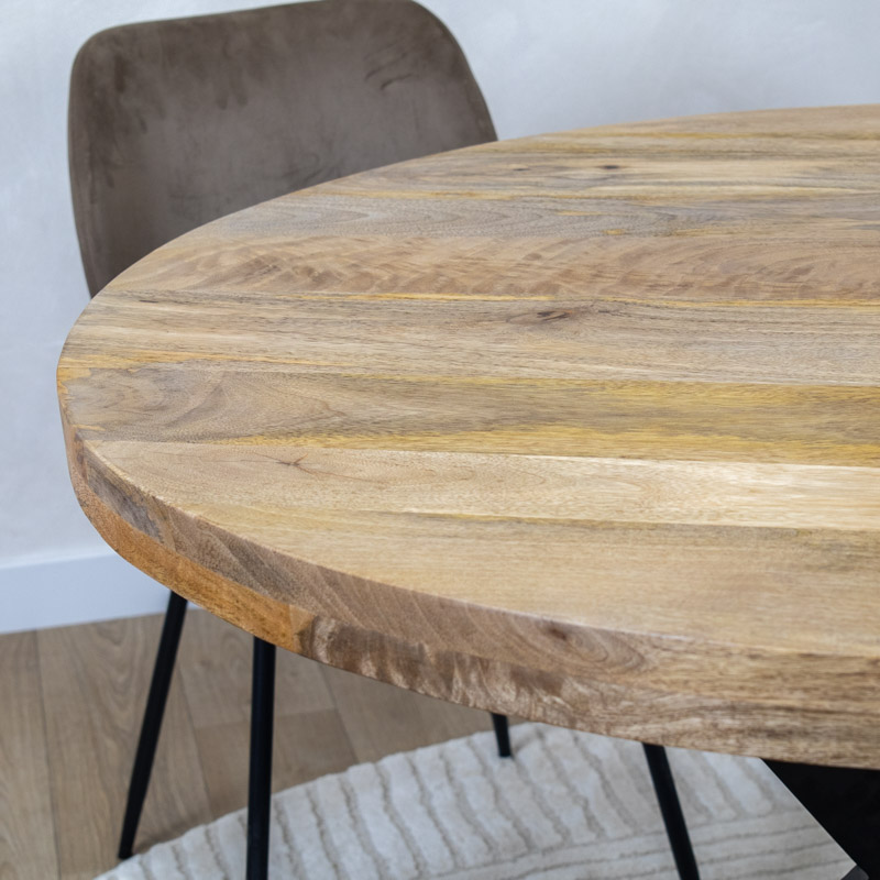 De eettafels uit de Navi-serie combineren de warme uitstraling van naturel mangohout met het stoere karakter van een metalen matrixpoot. Verkrijgbaar in meerdere formaten — van compact rond (Ø110 cm) tot royaal ovaal (240 cm) — bieden deze tafels veelzijdige inzetbaarheid in uiteenlopende interieurs. De naturel afwerking maakt ze breed toepasbaar, terwijl het robuuste ontwerp garant staat voor stevigheid en een lange levensduur. Ideaal voor zowel horeca als woonprojecten.
