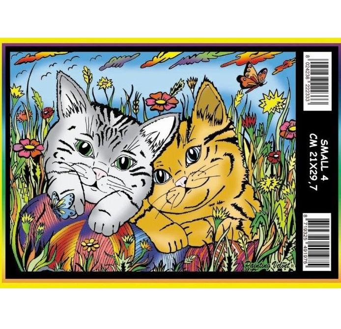 Deze fluwelen kleurplaat met twee speelse kittens is een leuke creatieve activiteit voor kinderen en kattenliefhebbers. De zachte fluweelranden vormen duidelijke lijnen, waardoor het makkelijker wordt om netjes binnen de vakjes te kleuren.