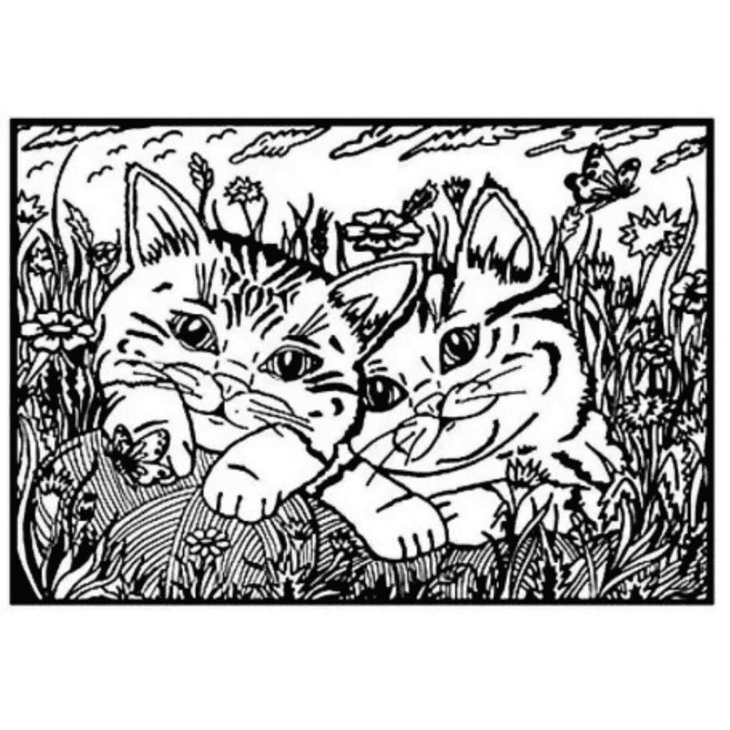 De vrolijke scène met kittens, bloemen en een vlinder maakt deze kleurplaat extra leuk om rustig aan te werken. Terwijl je kleurt komt het hele tafereel steeds meer tot leven.