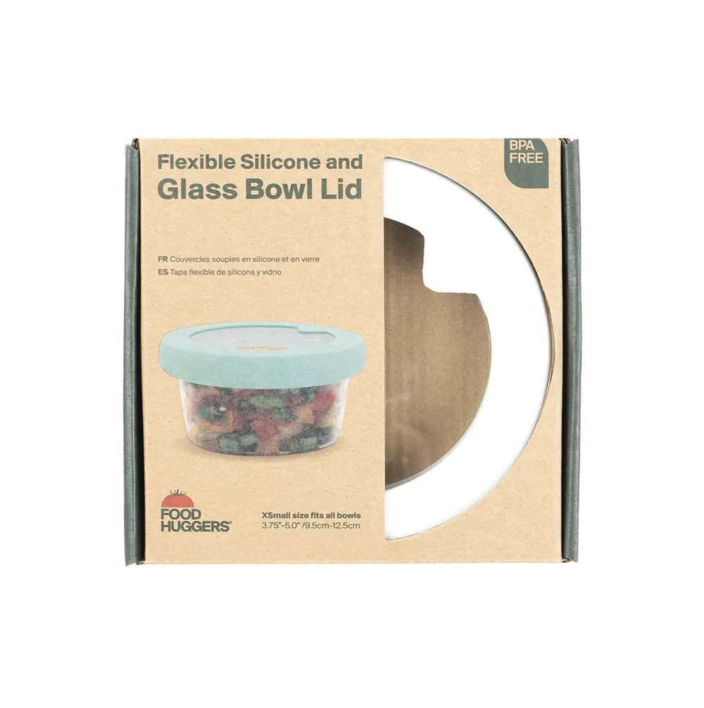Plasticvrij deksel van glas en silicone. Sluit luchtdicht af, stapelbaar en geschikt voor kleine kommen. Minder afval, meer overzicht.