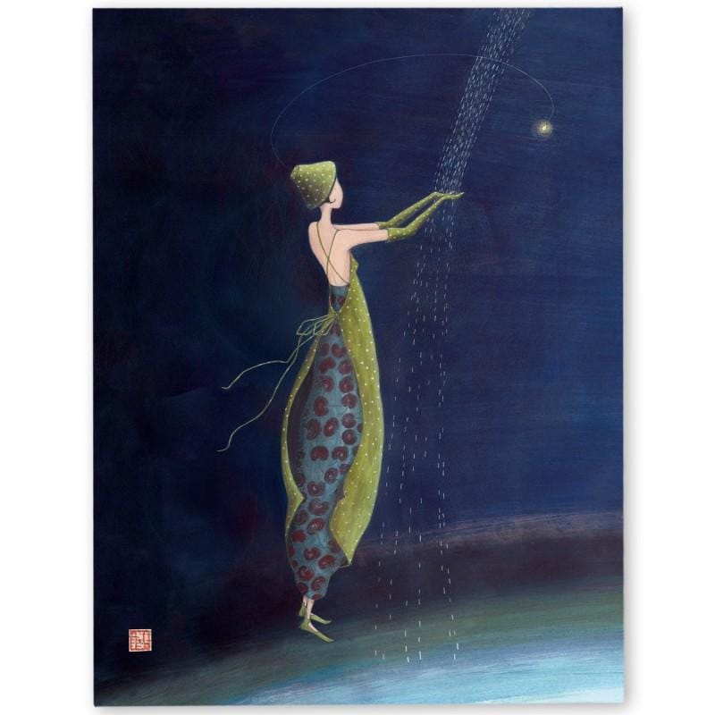 De poster La Pluie is een verstilde en poëtische illustratie van Gaëlle Boissonnard. De zachte regen, het spel van licht en de elegante houding van de figuur roepen een gevoel op van rust, overgave en reflectie.