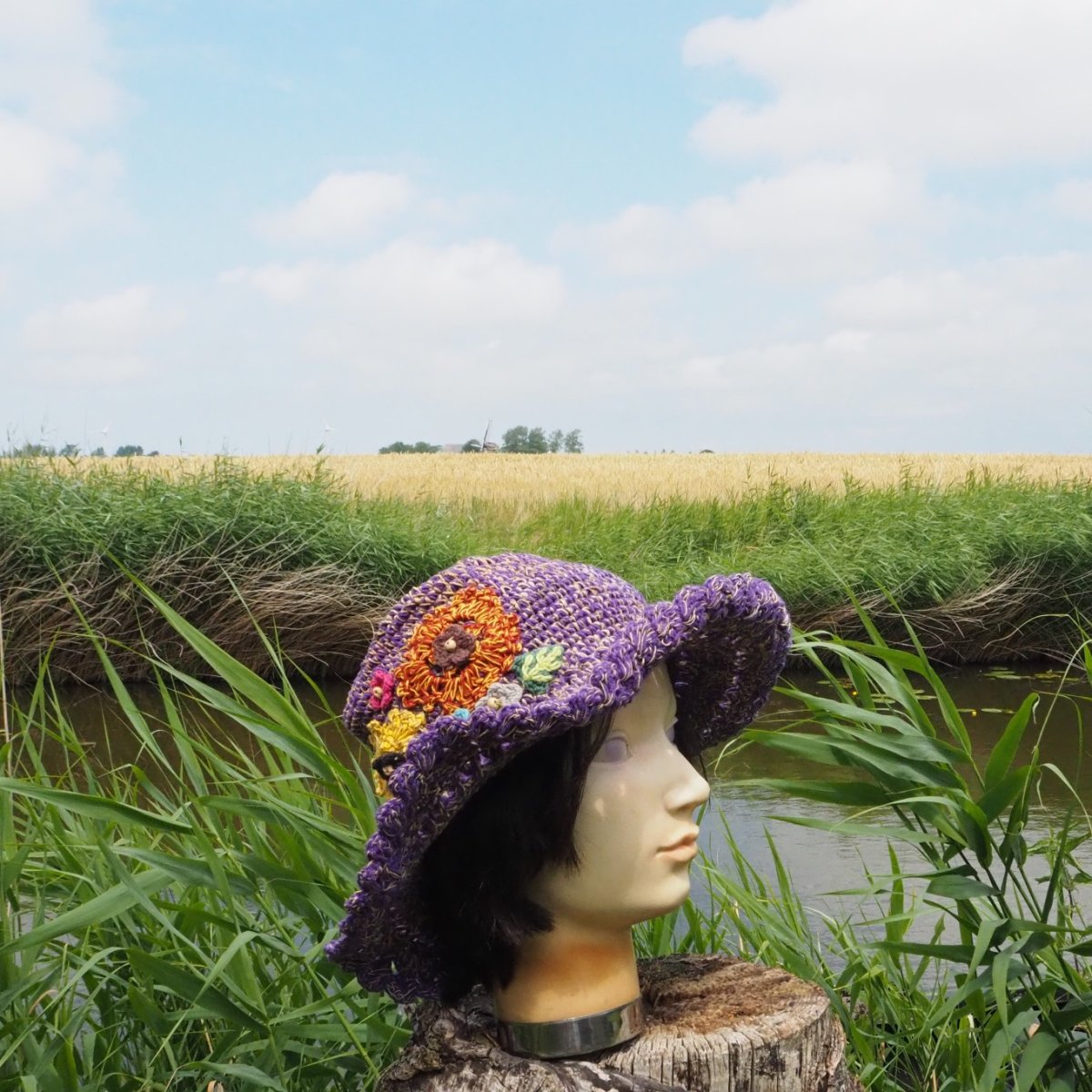 Voor op de hoed zitten mooie gehaakte bloemen in leuke kleuren, met in het midden een kraal.