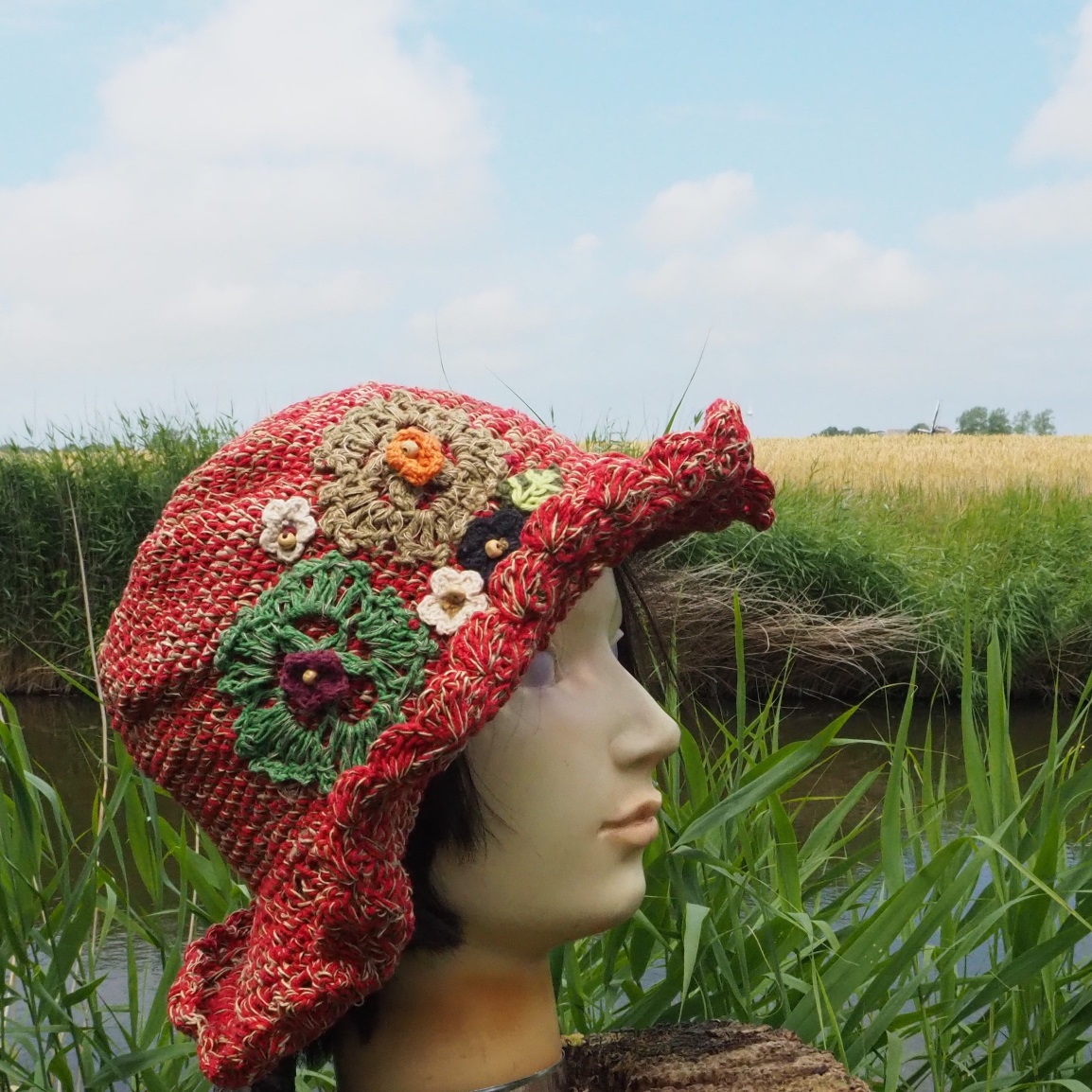 Voor op de hoed zitten mooie gehaakte bloemen in leuke kleuren, met in het midden een kraal.
