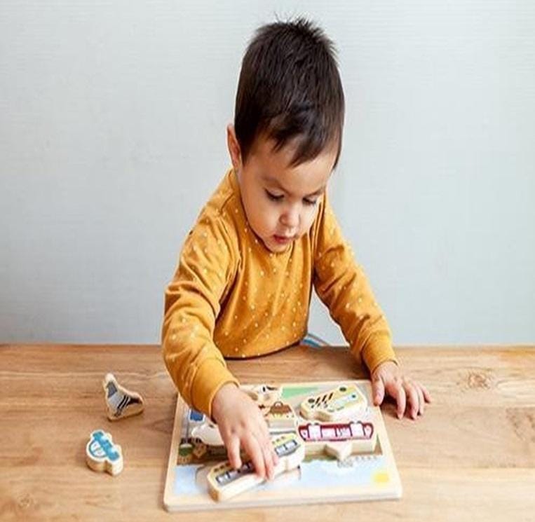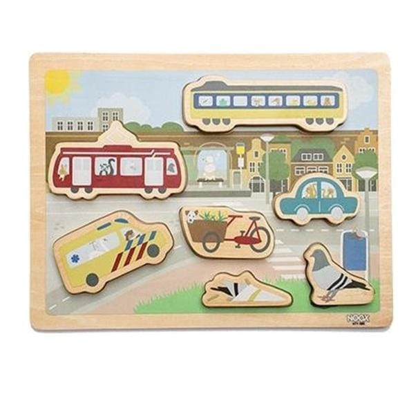 De 7 stevige speelstukken tonen herkenbare elementen uit de stad, zoals voertuigen en stadsdetails. Kinderen kunnen de stukken in de puzzel plaatsen én er los mee spelen, wat creativiteit, fantasie en fijne motoriek stimuleert. Een mooie combinatie van puzzelen en open-ended speelgoed.