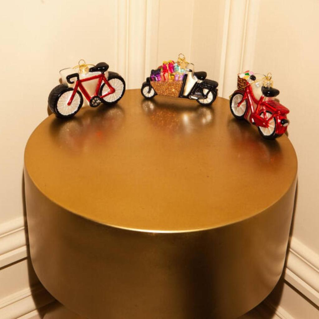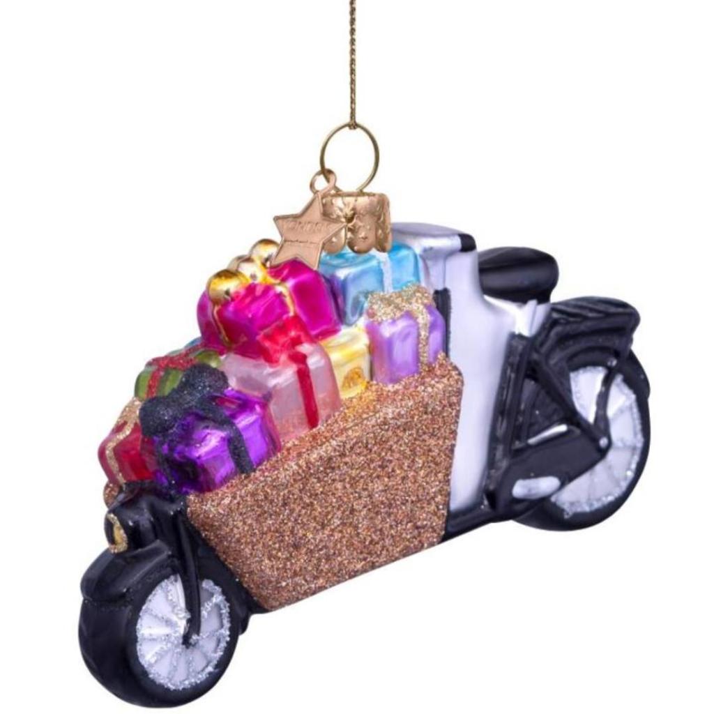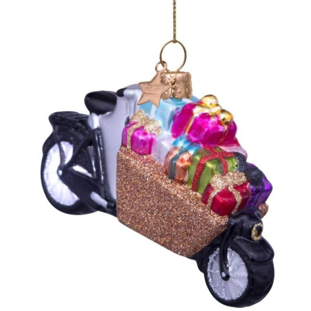 Een feestelijke rit vol verrassingen! Deze glazen kerstbal van Vondels toont een stoere zwarte bakfiets, volgeladen met kleurrijke cadeautjes in een glinsterende gouden bak. Elk pakketje is met zorg beschilderd en voorzien van vrolijke details. Of je nu een fietsliefhebber bent of gewoon houdt van originele kerstdecoratie: deze handgemaakte bakfiets brengt gegarandeerd een glimlach.