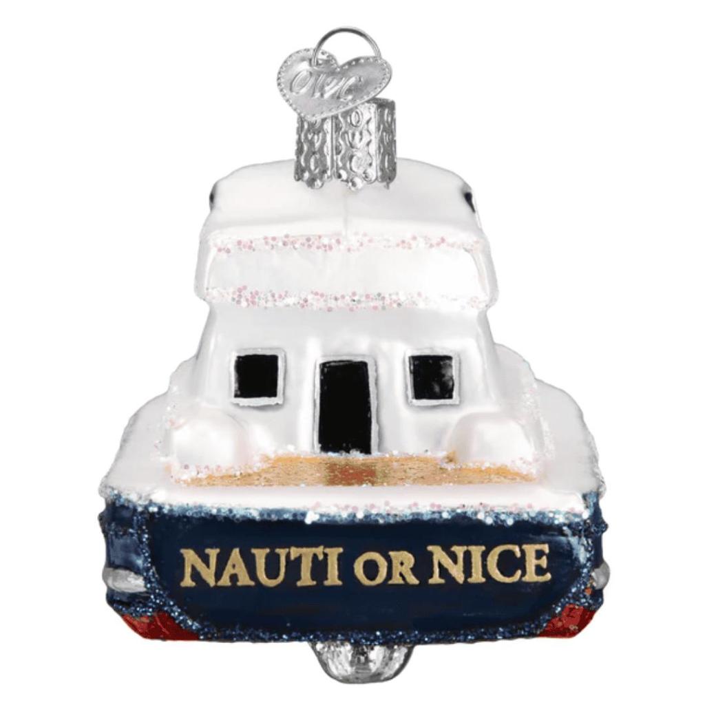 Ahoy, kerstliefhebbers! Met deze Kerstbal Boot van Old World Christmas haal je een vrolijke knipoog naar het nautische leven in je boom. Het glazen ornament is met de hand geblazen en gedecoreerd in klassieke kleuren: een dieprode en marineblauwe romp met witte bovenbouw. Achterop prijkt de speelse tekst “Nauti or Nice”, die meteen een glimlach oproept.