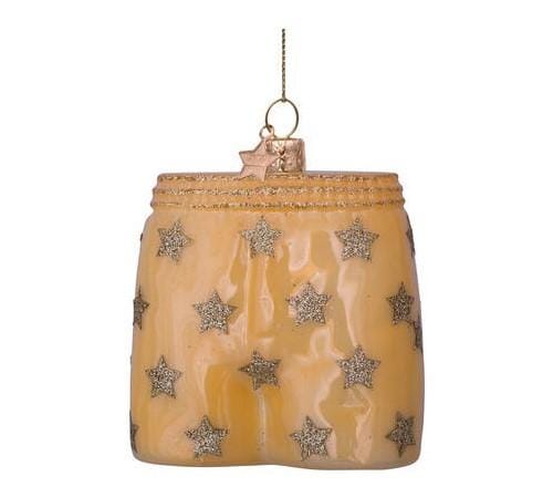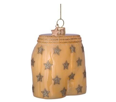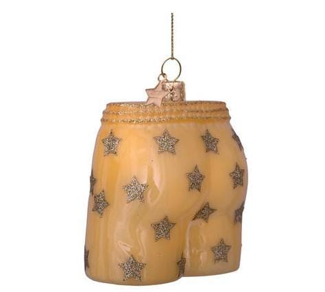 Deze kerstbal in de vorm van een boxershort is een humoristisch en opvallend ornament voor in de kerstboom. De gele kleur wordt gecombineerd met gouden sterren, wat zorgt voor een feestelijke uitstraling met een knipoog. Een originele keuze voor wie houdt van kerstdecoratie die nét even anders is.