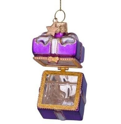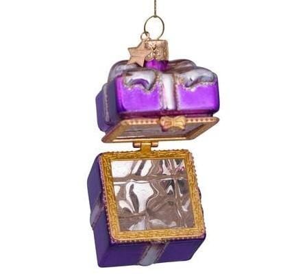Maak van je kerstmis dit jaar iets extra feestelijk met de Kerstbal Cadeaudoosje Paars! Deze unieke kerstbal is gemaakt van hoogwaardig glas en heeft de vorm van een klein cadeaudoosje, compleet met een glanzende paarse afwerking. De details zijn prachtig, met een realistische textuur en een subtiele glans. De kerstbal is perfect om te vullen met kleine cadeautjes, zoals snoepgoed, briefjes of andere kleine verrassingen. Hang de kerstbal in je kerstboom en laat je dierbaren met spanning raden wat er in zit!