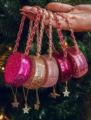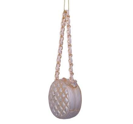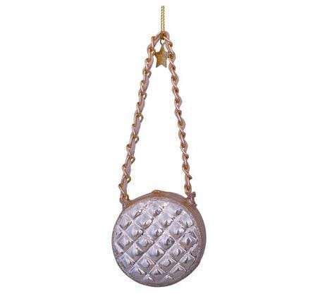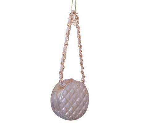 Deze ronde damestas-kerstbal in champagnekleur is een elegante toevoeging aan de kerstboom. Het doorgestikte patroon en de goudkleurige schakelketting geven het ornament een luxe uitstraling. De zachte glans vangt het licht mooi en combineert moeiteloos met andere fashion- en lifestyle-ornamenten. Een stijlvol detail voor wie houdt van mode, accessoires en verfijnde kerstdecoratie.