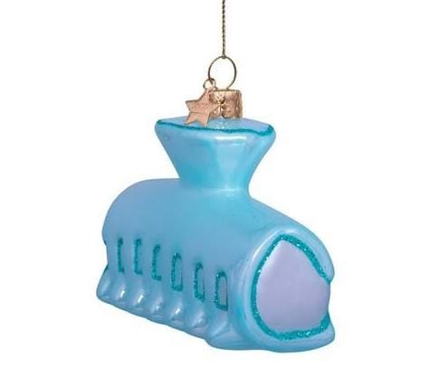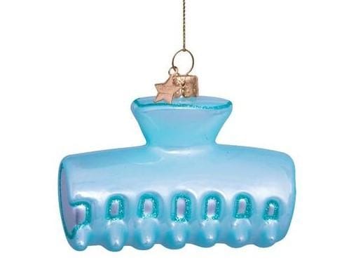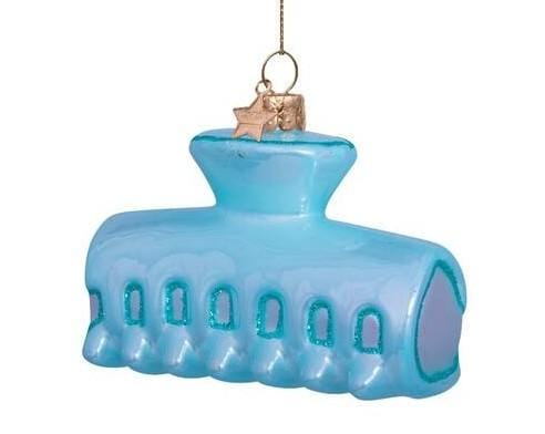 Deze speelse kerstbal van Vondels is vormgegeven als een trendy haarclip in een zachte lichtblauwe tint. De glanzende afwerking en het herkenbare ontwerp maken dit ornament een frisse en moderne toevoeging aan de kerstboom. Een perfecte mix van fashion en humor.