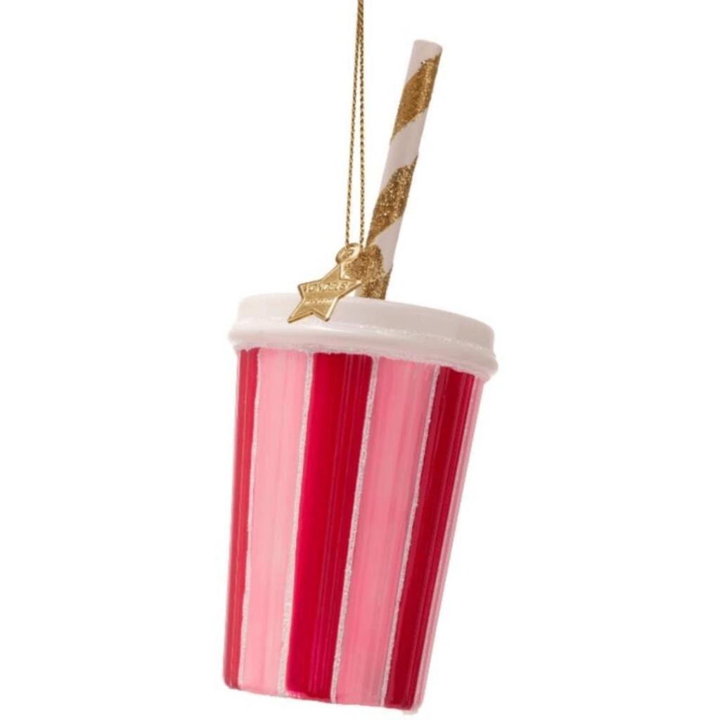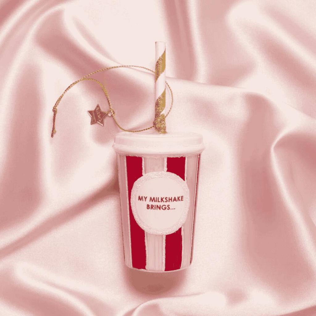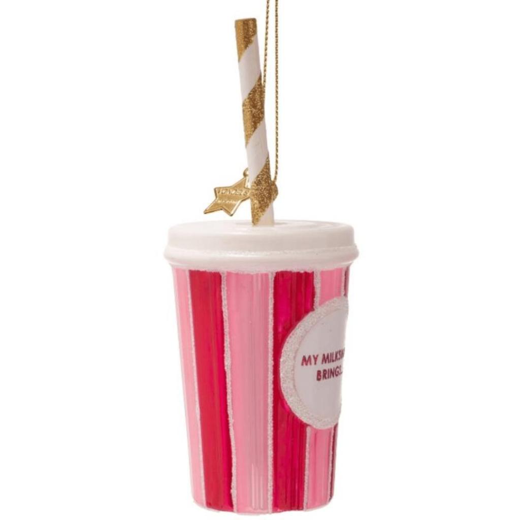 “My milkshake brings…” – dit vrolijke ornament van Vondels zegt genoeg! De gestreepte roze beker met goudglitter rietje is speels, retro en onweerstaanbaar. De kerstbal is handgemaakt van glas en voorzien van de herkenbare gouden Vondels-hanger. Hoogte: 15,5 cm.