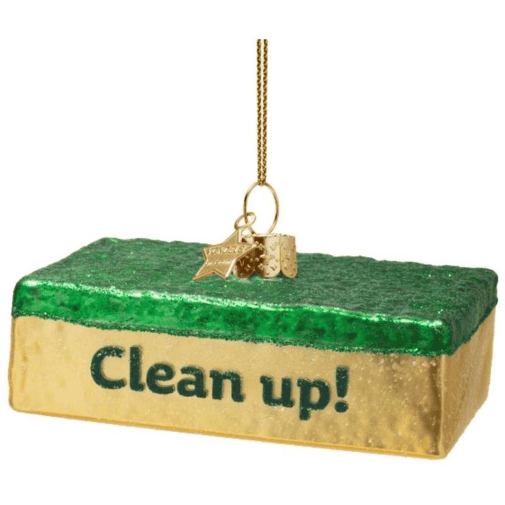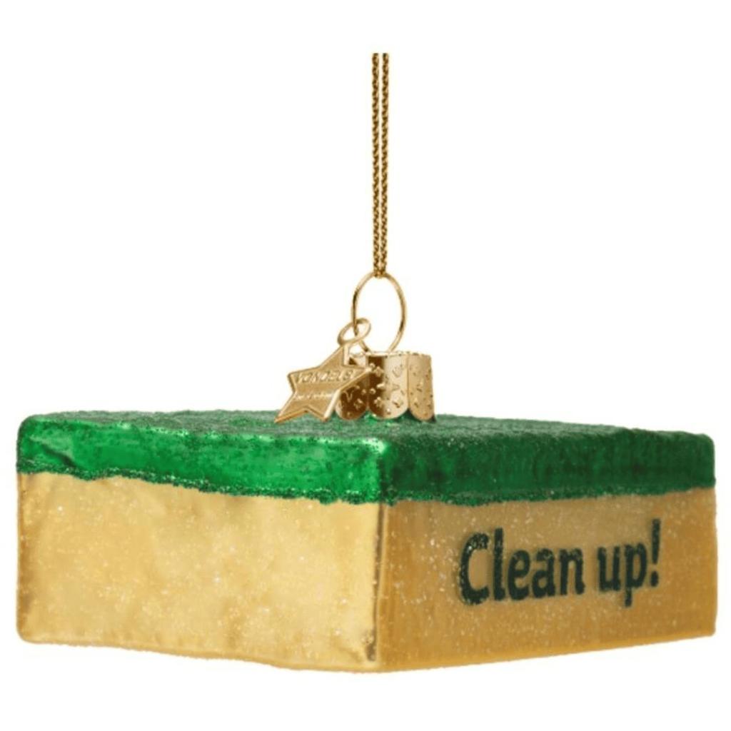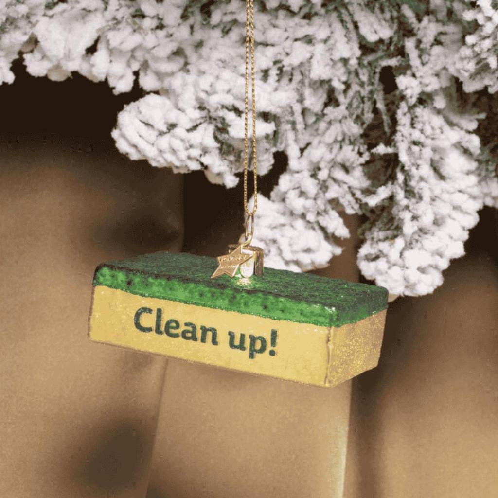 Kerstbal Schuurspons – Glazen ornament met glitters en tekst ‘Clean up!’ van Vondels