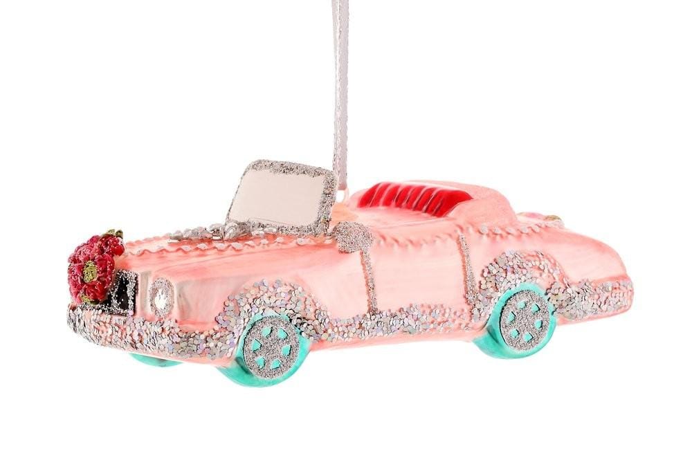 Dit jaar heb je volop keus wanneer je jezelf of iemand anders gelukkig wilt maken met deze mooie roze Trouwauto. Voorop zit een mooie bos bloemen en de hele auto is versierd met zilveren glinsters, maar het mooiste van deze auto zijn natuurlijk de mintgroene banden. De glazen hanger is 12,5 cm lang en ca. 5 cm hoog en breed.