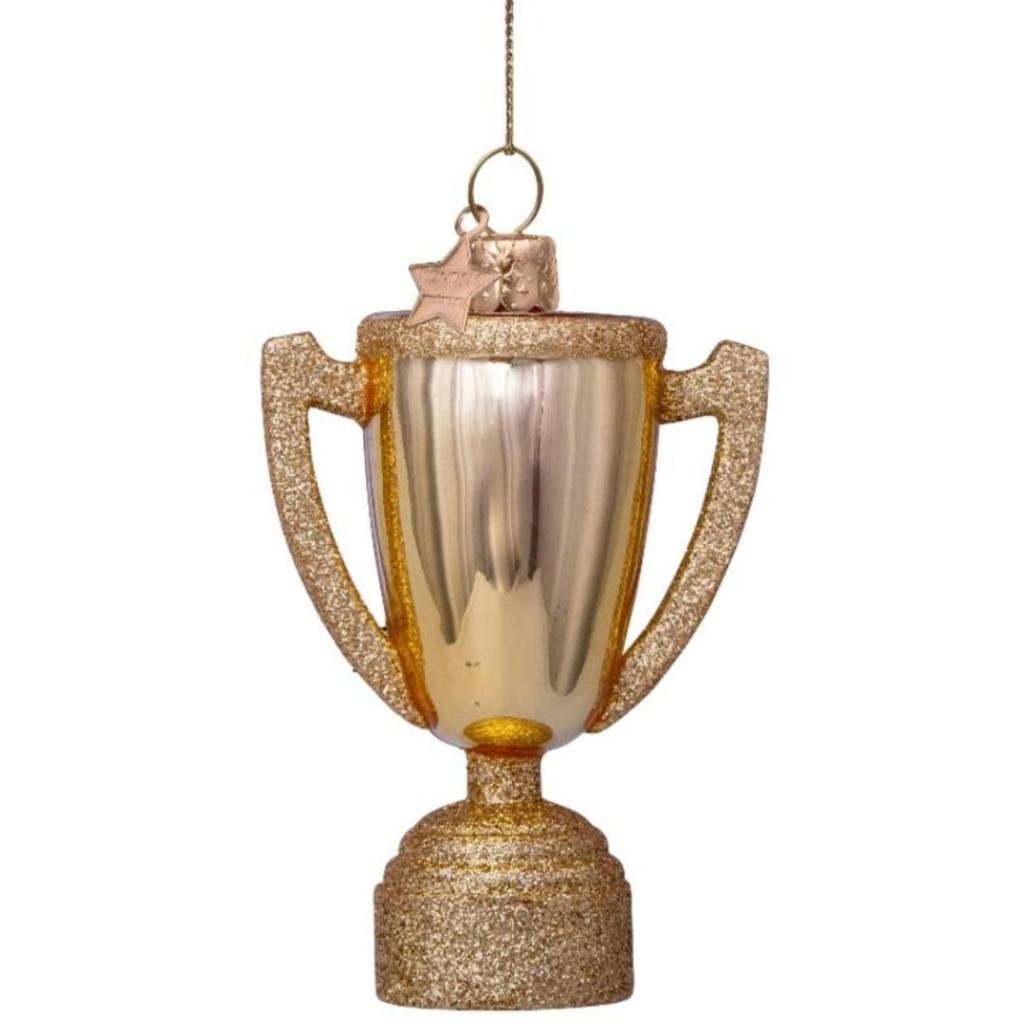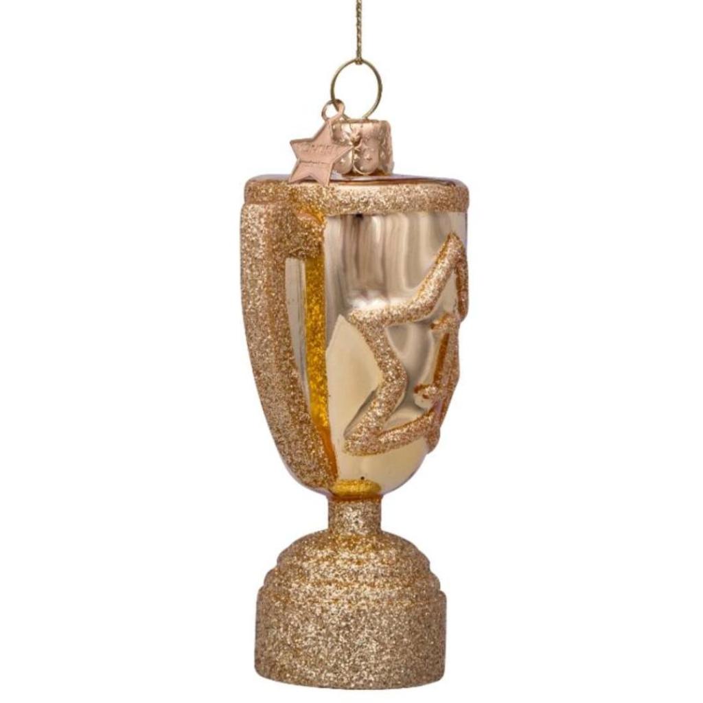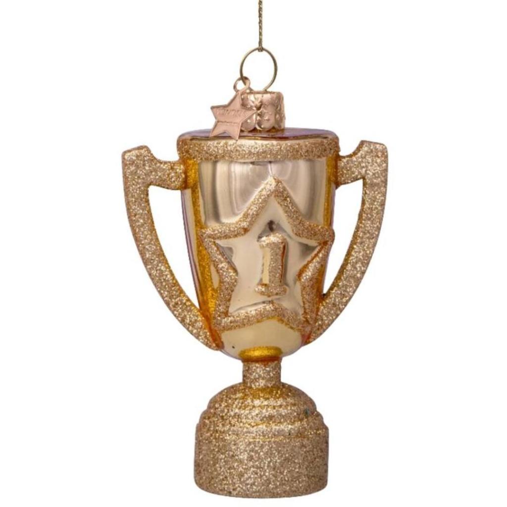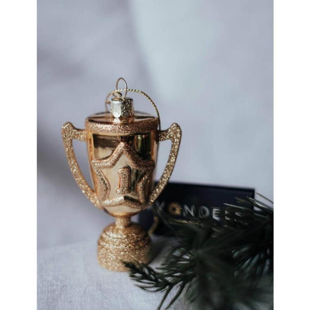 Ben jij of ken jij een echte nummer één? Met deze sprankelende kerstbal in de vorm van een trofee zet je de winnaar in het zonnetje – recht in de kerstboom! Dit glazen ornament van Vondels is mondgeblazen en handbeschilderd, met schitterende glitterdetails op de ster en voet van de beker. Perfect om cadeau te doen aan een kampioen, collega van het jaar of jezelf natuurlijk.