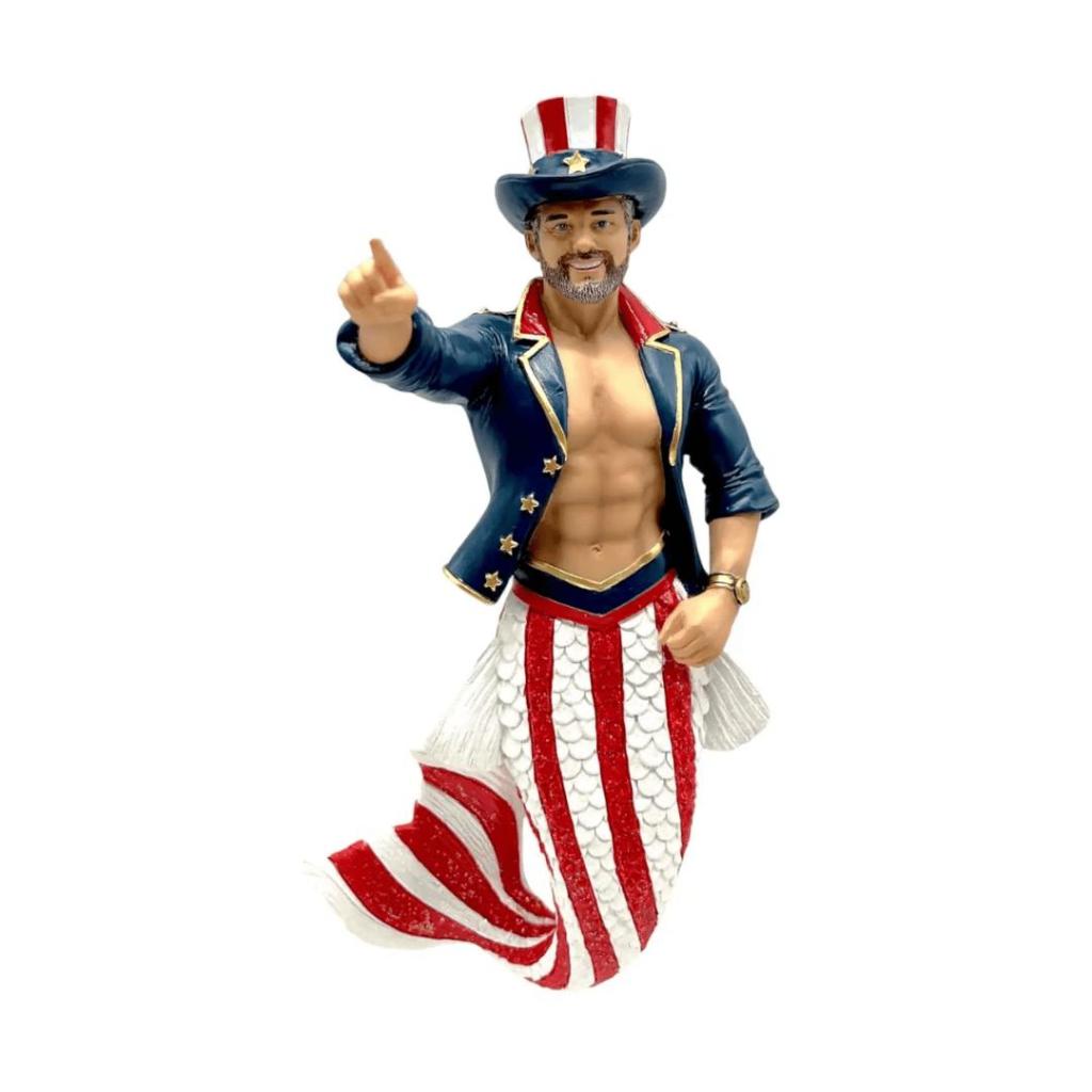 De Zeemeerman Guncle Sam van December Diamonds is een feestelijke knipoog naar de iconische Uncle Sam, maar dan met een kleurrijke, glitterende twist. Met zijn rood-witte staart, glanzende sterrenaccenten, open marineblauwe jas en hoge hoed is hij een opvallende verschijning die direct de aandacht trekt.