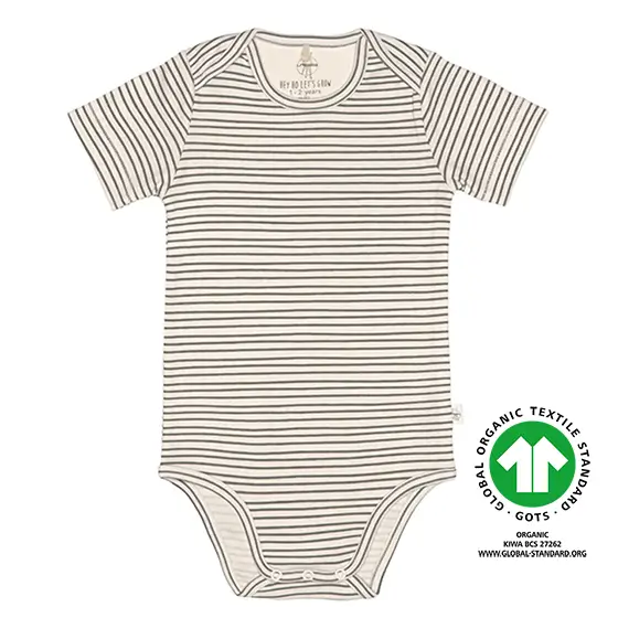 Comfortabele baby romper van biologisch katoen met drukknopen. Zacht, praktisch en GOTS‑gecertificeerd.