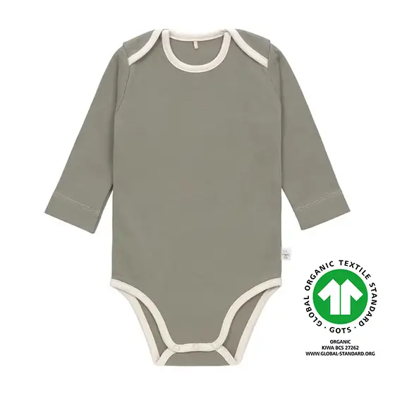 Groene romper van biologisch katoen. Overslag in kleine maten, drukknopen voor gemak en comfort.