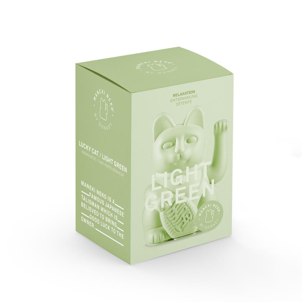 De Lucky Cat in lichtgroen is een moderne uitvoering van de klassieke Maneki Neko, de beroemde gelukskat uit Japan. Volgens de traditie brengt zijn wuivende poot geluk, voorspoed en rijkdom. De munt die hij vasthoudt symboliseert “SEN MAN RYOU”, oftewel 10 miljoen goudstukken – een teken van overvloed.