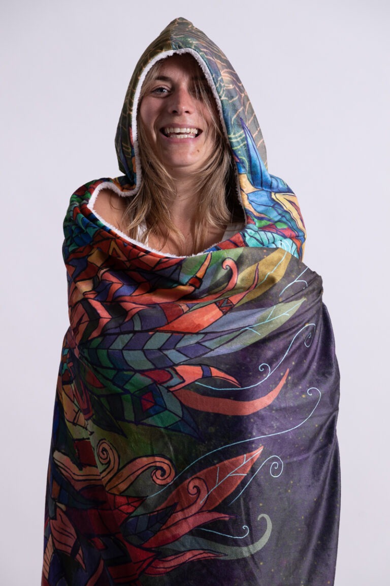 De Spacedeken is ook te gebruiken als hoodie, je kunt hem lekker om je heen wikkelen wanneer je naar buiten gaat.