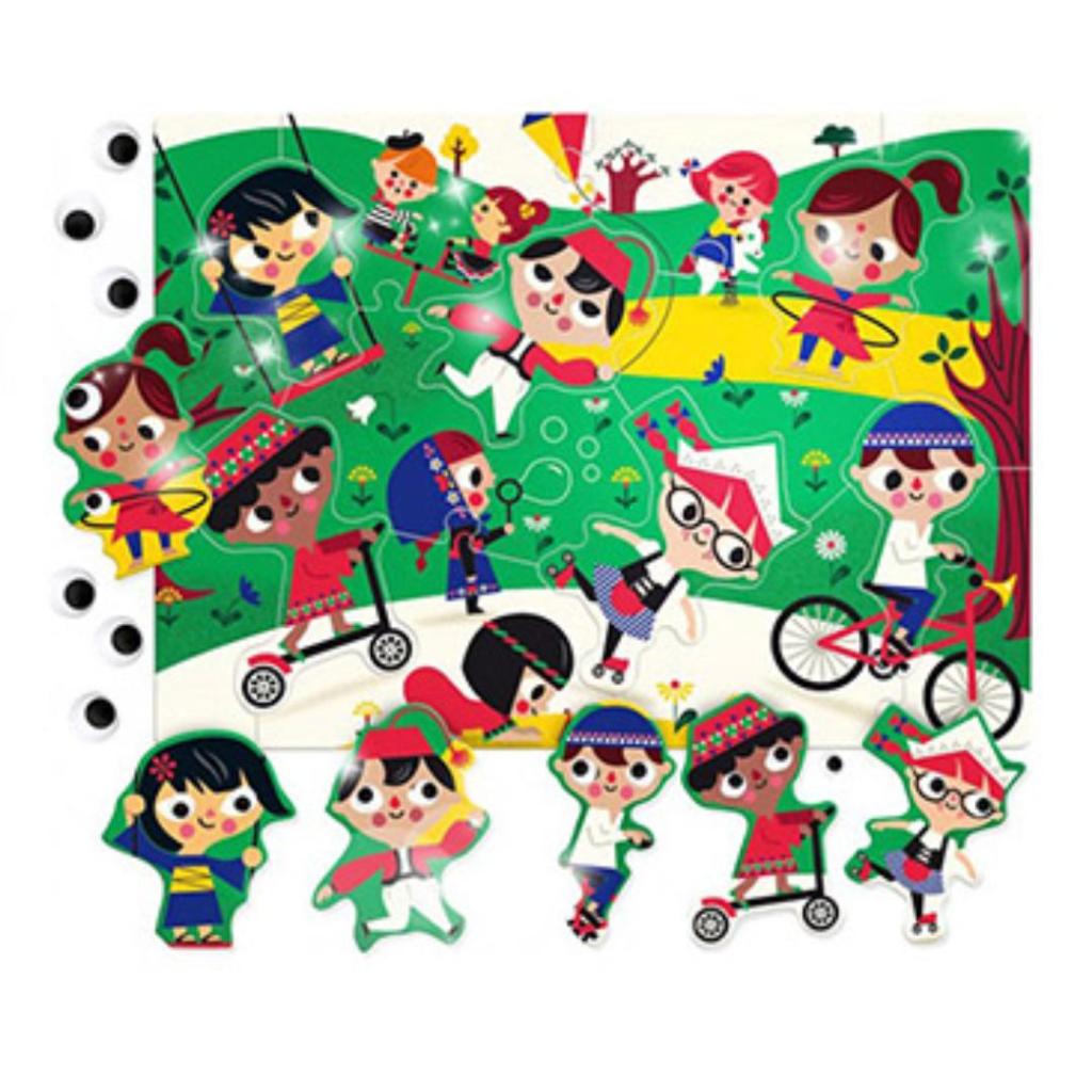 Deze extra grote puzzel laat kinderen spelenderwijs kennismaken met kinderen van over de hele wereld. De vrolijke illustraties en het meegeleverde stickervel met bewegende wiebeloogjes maken puzzelen nét even leuker en interactiever.