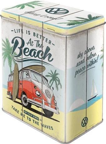 Droom je van zon, zee en vrijheid? Dit vrolijke bewaarblik met vintage Volkswagen T1 bus en surfsfeer brengt het strandgevoel naar je keuken. Het robuuste metalen blik toont een rode VW bus met surfplank, palmbomen en inspirerende teksten zoals “Life is better at the beach”. Ideaal om je koekjes, koffie of vakantiegeld in te bewaren – of gewoon als stijlvol decoratiestuk.