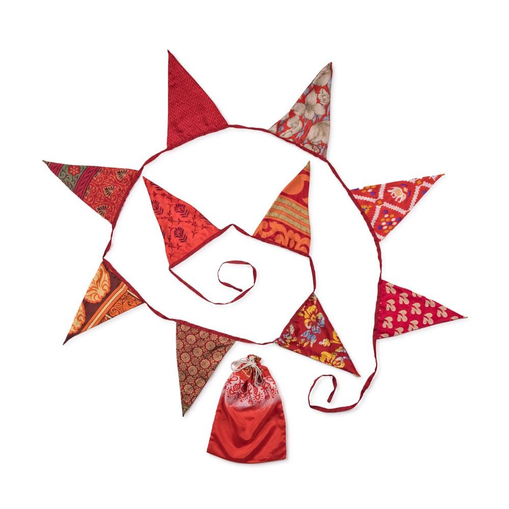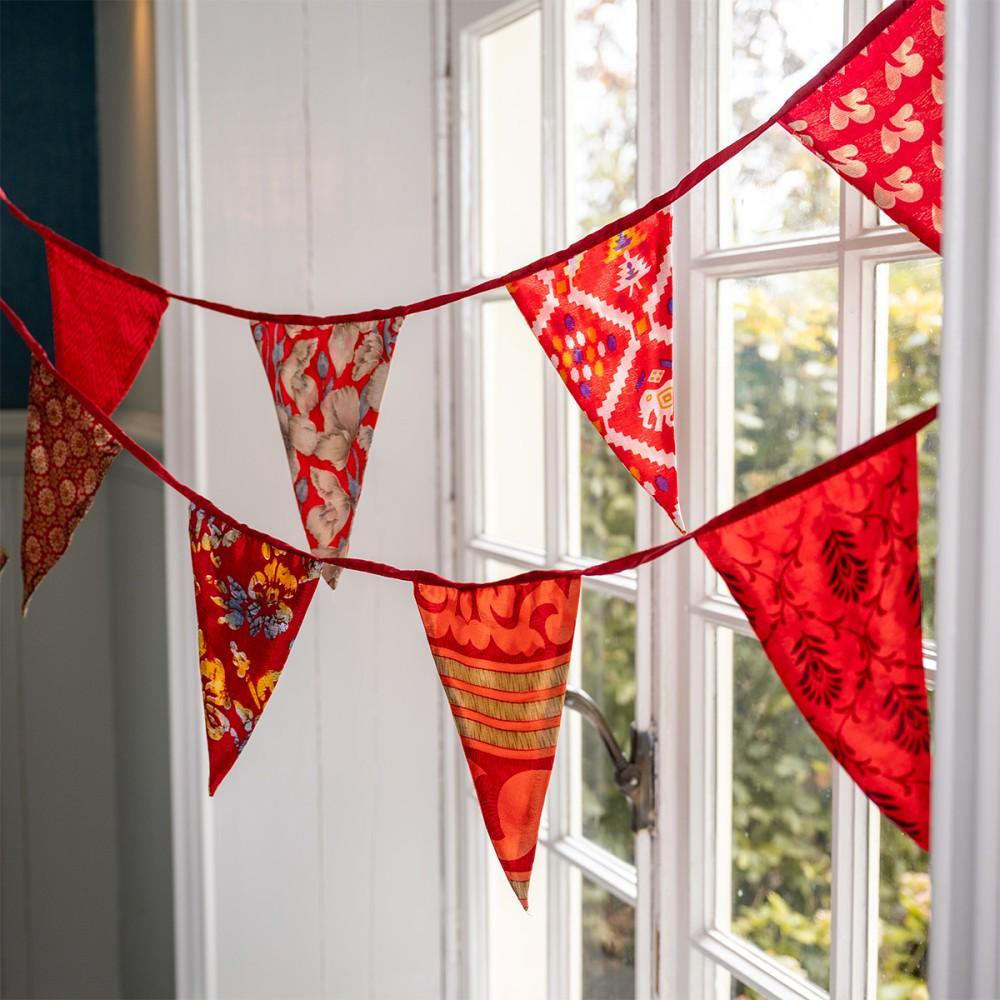 Breng warmte en sfeer in huis of tuin met de Sarislinger Vlag Rood-Oranjetinten Large! Deze prachtige slinger is met de hand gemaakt van gerecyclede sari’s, traditionele Nepalese kledingstukken, waardoor elk exemplaar uniek is. De levendige rood- en oranjetinten geven een feestelijke en gezellige uitstraling, perfect voor verjaardagen, feestjes of als decoratieve eyecatcher. Door de fairtrade productie ondersteun je Nepalese vrouwen, die met zorg en vakmanschap deze unieke slingers maken. De slinger wordt geleverd in een bijpassend zakje, zodat je hem gemakkelijk kunt opbergen en hergebruiken.
