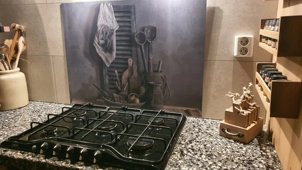 Mooi Sobere en stoere Spatschermen voor achter het fornuis op aluminium geprint , makkelijk af te nemen en schoon te houden.