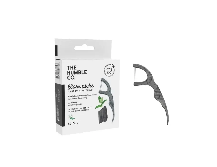 Floss picks van bioplastic met dubbele draad en tandenstoker. Met munt en houtskool. Vegan, BPA-vrij en plasticvrij verpakt.