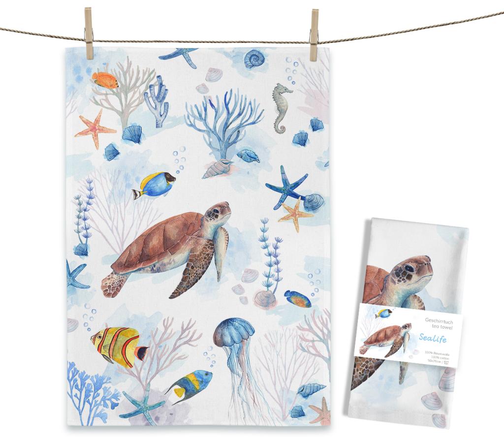 Breng een vleugje oceaan in je keuken met de theedoek Sealife, voorzien van een liefdevol met de hand geschilderd aquarelontwerp van Christine Matthies. Op de doek ontdek je zeeschildpadden, zeepaardjes, kleurrijke vissen en koraal, allemaal in zachte, waterverfachtige tinten.