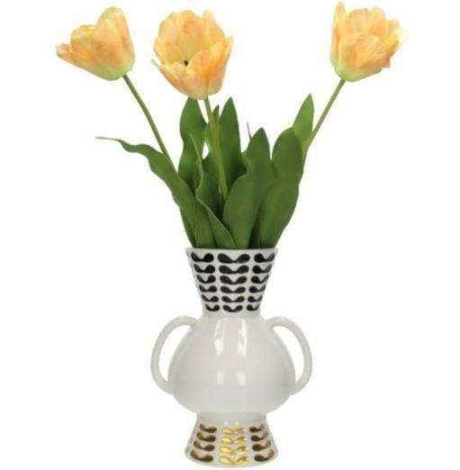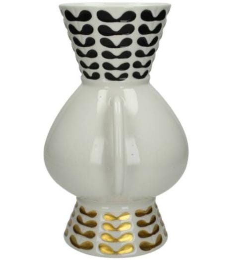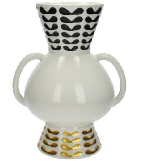Met de serie Graphic Vazen van het Nederlandse woonmerk Kersten, waan je je weer helemaal in de eighties. De keramische vazen hebben een speelse vorm die extra wordt geacentueerd door de grafische afbeeldingen in wit, zwart en goud. De afgebeelde vaas is 28cm hoog en is 22 x 18cm breed.